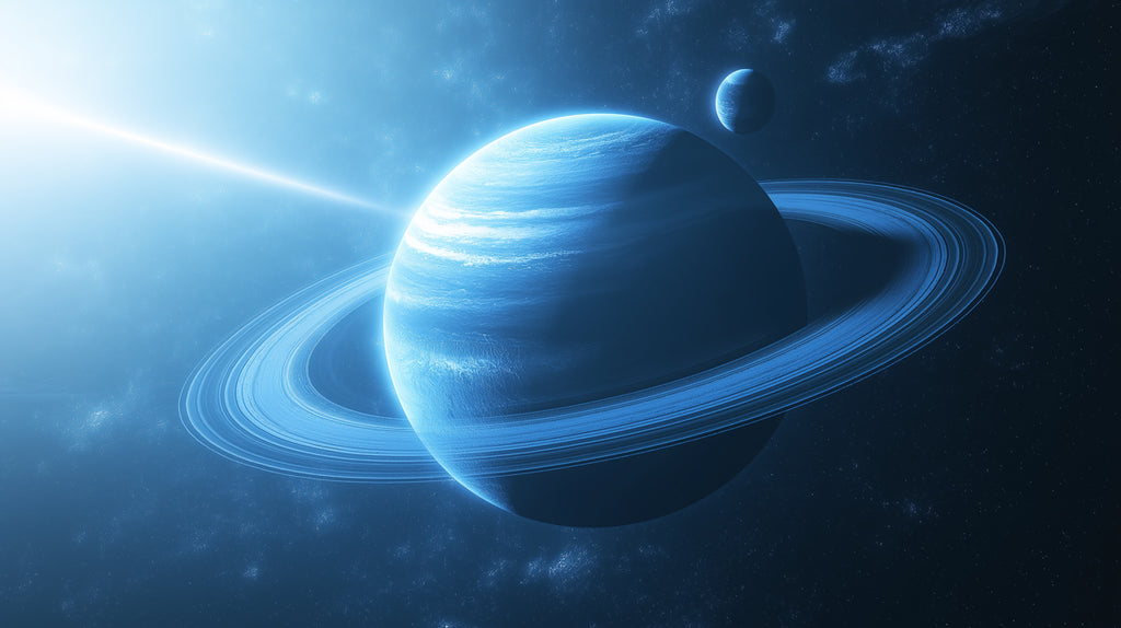 The Blue Gas Giant Ray of Light Mural Wallpaper features a stunning, high-definition image of a large, ringed blue gas giant. The planet is brightly illuminated by a sharp, diagonal ray of light cutting through the upper left corner, highlighting the planet's azure blue bands and complex ring structure. The background is a soft blend of dark cosmic clouds and distant stars, enhancing the dramatic lighting and the planet's vast scale. This mural is perfect for a futuristic office, a gaming den, or a modern living room seeking a clean, dramatic, and cool-toned cosmic focus.