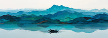 The Blue Gradient Watercolor Mountains Mural Wallpaper features layers of mountain silhouettes in varying shades of blue, fading into the distance. A small boat with a fisherman floats peacefully on the calm lake in the foreground. The watercolor texture adds softness and depth, creating a tranquil and meditative scene perfect for relaxation.