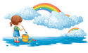 The Cartoon Rainbow Creation Scene Mural Wallpaper is a cheerful and imaginative artwork. It features a young girl standing in blue water, looking up at two huge, fluffy white clouds connected by a massive, arching rainbow. The girl holds a paintbrush and bucket of paint, suggesting she is the artist of this vibrant fantasy. The clean, crisp illustration style and bright colors create a sense of joy, wonder, and innocent creativity. This mural is ideal for a nursery, a bedroom, or a space designed to foster imagination.