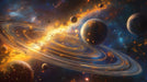 The Celestial Metropolis Ring System Mural Wallpaper is a vibrant and complex fantasy space scene. Multiple ringed planets, illuminated by a brilliant orange nebula, float alongside other celestial bodies that appear to have glowing "city lights" on their surfaces. The massive ring system dominates the foreground with a swirling mix of gold, orange, and blue. The intense contrast and high level of detail create a maximalist, energetic, and imaginative sci-fi world. This mural is ideal for a lively gaming room, a nursery, or a bold creative office.