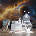 Agrega un margen de seguridad de 6 a 10 cm. El área total se calcula en metros cuadrados y se redondea al número entero más cercano.Celestial Metropolis Ring System Mural Wallpaper | Orange and Blue Contrast, Multiple Planets, Cosmic City Lights