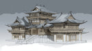 This architectural concept sketch depicts a grand multi-tiered Chinese palace or pagoda complex. The illustration is executed in a monochromatic ink and pencil style, showing intricate rooflines, curved eaves, and multiple layered structures with a central set of ascending stairs. The soft shading and fine line work give the image a delicate yet majestic quality, focusing on the complex structure of traditional East Asian architecture.