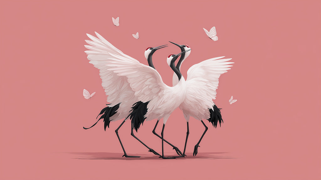 The Dancing Cranes Simplicity Mural Wallpaper is an elegant and minimalist piece, celebrating traditional East Asian motifs. It features two red-crowned cranes in a graceful, intertwined dance, their white and black wings creating a perfect, balanced composition. The illustration is set against a clean, muted mauve-pink background, with a few white butterflies adding a subtle, ethereal movement. The focus is entirely on the stylized forms and the symbolism of longevity and luck. This mural is an ideal choice for a luxurious master bedroom, a minimalist dressing area, or an elegant dining room.