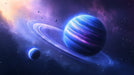 The Deep Blue Ringed Planet Mural Wallpaper features a majestic gas giant, dominated by deep blues and vibrant azure-purple bands, set against a dark, cosmic background. Its extensive, glowing rings add a dynamic, expansive element to the scene. The subtle background nebula is a mix of cool blue and pale orange/pink, providing a soft contrast to the planet's intense color. This visualization is grand, cool-toned, and highly detailed. It is excellent for a sophisticated home theater, a living room, or bedroom emphasizing technology and cosmic scale.