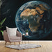 The Full Earth View Mural Wallpaper is a classic, high-definition satellite image of Earth, centrally focused on the African continent and surrounding landmasses. The planet is brightly illuminated, showcasing the tan deserts, green regions, and the deep, turbulent blue of the oceans. A vibrant blue atmospheric glow rings the sphere, creating a strong contrast with the deep blackness of space. This simple, powerful visualization conveys beauty, isolation, and fragility. It is an excellent choice for a entryway, a living room, or a commercial space with a global, environmental focus.