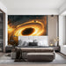 The Golden Black Hole Accretion Vortex Mural Wallpaper depicts a massive, fiery, and high-energy cosmic event. A bright, central golden vortex swirls intensely, surrounded by turbulent clouds of orange and red cosmic dust. Large, dark space rocks are visible in the foreground, being drawn into the event horizon. The rich, warm colors convey extreme heat and power, making for a dramatic and intense visual experience. This mural is perfect for a space needing maximum visual impact, such as a themed bedroom or a bold living room.