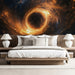 The Golden Ring Black Hole Accretion Disk Mural Wallpaper presents a powerful, face-on view of a massive black hole. The central dark void is framed by a blazing, glowing ring of golden-orange accretion energy, surrounded by fiery nebulas and dark space dust. The circular motion of the light creates a strong focal point and conveys extreme cosmic power. The aesthetic is warm, intense, and abstract. This mural is ideal for a bold statement wall in a modern commercial space, a contemporary living space, or a themed entertainment room.