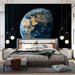 The Half-Shadow Earth Globe Mural Wallpaper captures the planet with the day/night terminator line clearly visible, dividing the illuminated Africa/Middle East from the shadowed side. This perspective creates intense drama and emphasizes the rotation and light of the world. The bright side shows detailed landmasses and ocean currents, while the shadowed side blends into the deep, dark blackness of space. The blue atmospheric halo provides a fragile boundary. This mural is excellent for a sophisticated meeting room or bedroom, symbolizing balance, time, and global scope.