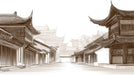 Transport yourself to a bustling ancient city with this panoramic wallpaper, featuring a perspective view of a traditional street lined with historic buildings. The artwork, rendered in sepia tones, showcases the intricate upturned eaves, wooden facades, and stone pavements characteristic of old China. The depth of the perspective draws the eye down the street, expanding the visual space of the room. This illustration evokes a sense of travel, culture, and the hustle and bustle of history, perfect for corridors, living room, or cultural centers.