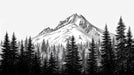 The Majestic Mountain & Pine Forest Mural Wallpaper is a bold, detailed, and striking artwork. It features a towering, snow-capped peak rendered in intricate stippling and hatching, rising above a dense, dark evergreen forest. The high-contrast black and white palette creates a dramatic and timeless natural scene. This mural is ideal for a statement wall in a commercial space, a rustic lounge, or an office seeking a powerful natural focal point.