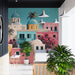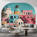 The Vibrant Pink Mediterranean Village Mural Wallpaper is a cheerful and sunny artwork. It features a colorful landscape of stylized buildings in shades of pink, yellow, and blue, reminiscent of a Mediterranean coastal town. The bright colors and flat, modern illustration style evoke a sense of vacation and joy. This mural is ideal for a restaurant, a bright commercial space, or a creative workspace.