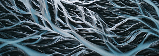 Vivawalls StoreCapturez la beauté brute de la nature avec cette vue aérienne abstraite d'un delta glaciaire. Le jeu de nuances de bleu marine profond et de bleu g...