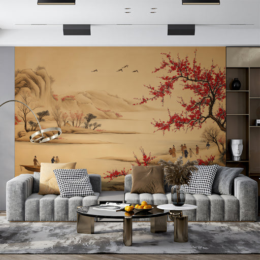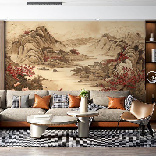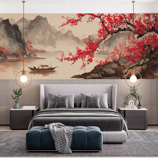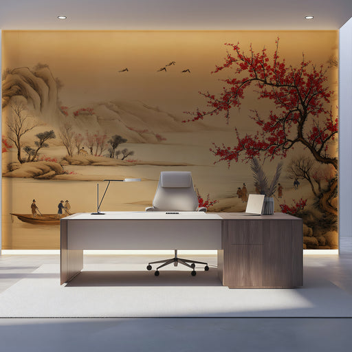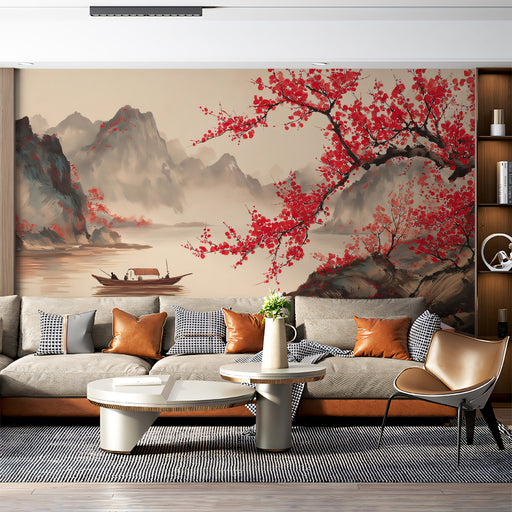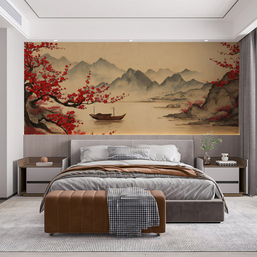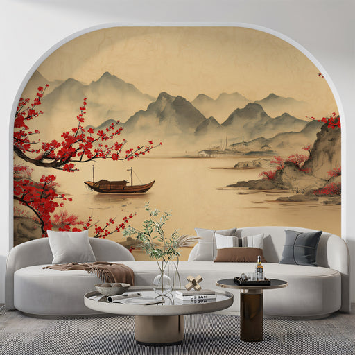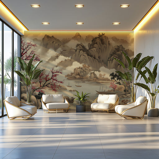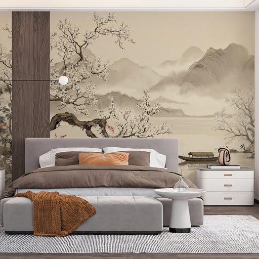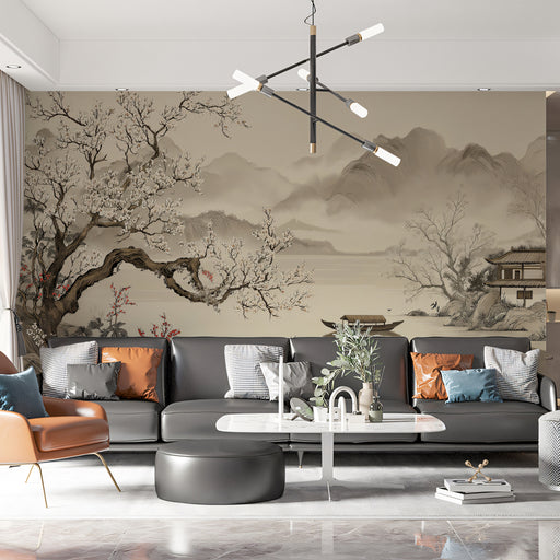 This serene Chinese Plum Blossom Mural Wallpaper brings a sense of profound calm and artistic elegance to any space. The design features a delicate, flowering branch with beautiful white blossoms framing a tranquil scene. The backdrop is a soft, misty landscape with a traditional village and a sailboat on a serene body of water, all rendered in a soothing monochromatic palette of muted gray and off-white. The composition’s simplicity and harmony evoke a feeling of deep tranquility. This wallpaper is an ideal choice for creating a peaceful retreat in a living room, a serene bedroom, or a quiet study.