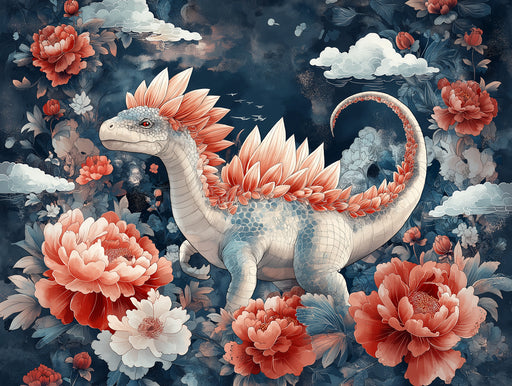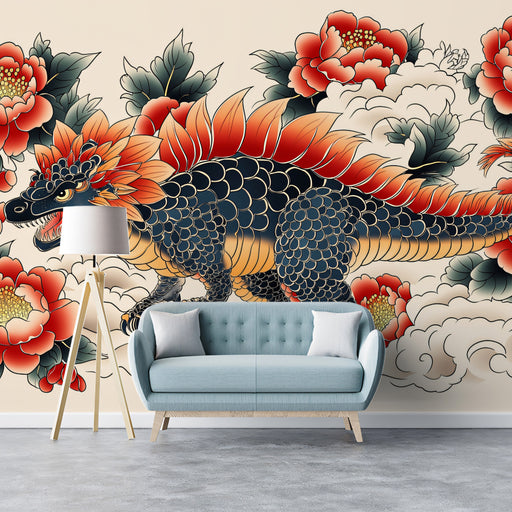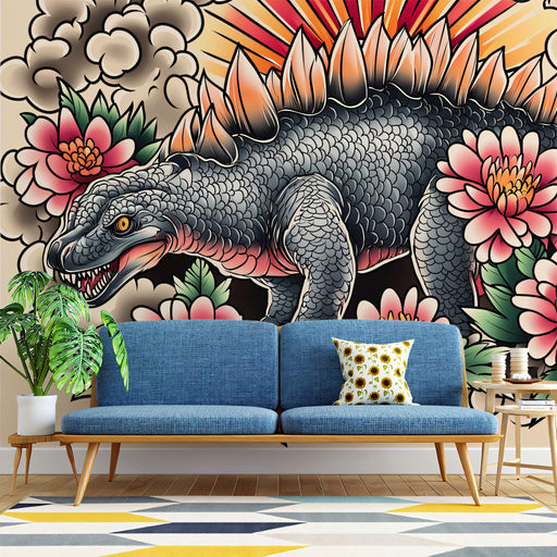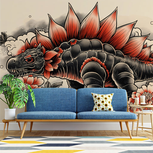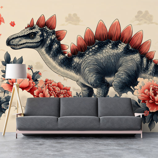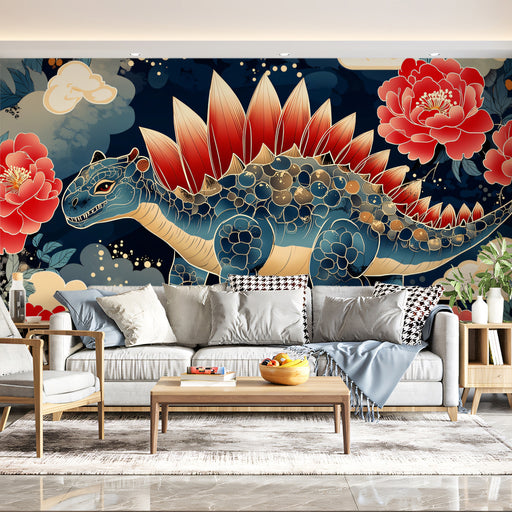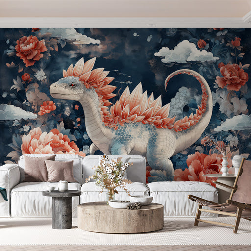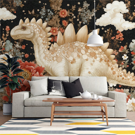 Ajoutez une marge de sécurité de 6 à 10 cm. La surface totale est calculée en mètres carrés et arrondie à l'entier le plus proche.Dynamic Stegosaurus Sky Art Mural Wallpaper | Mythical Reptile & Floral Fantasy
