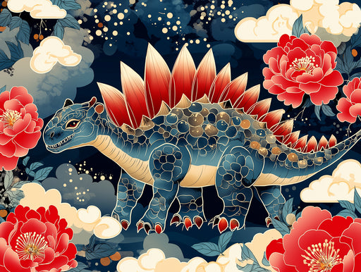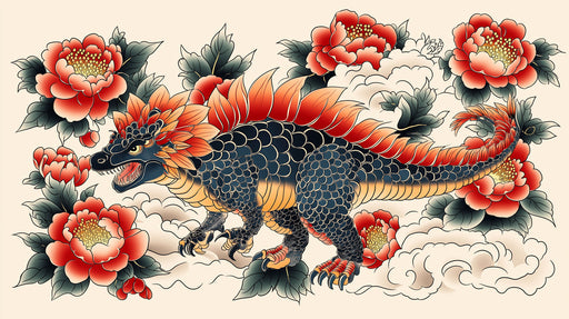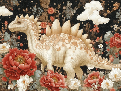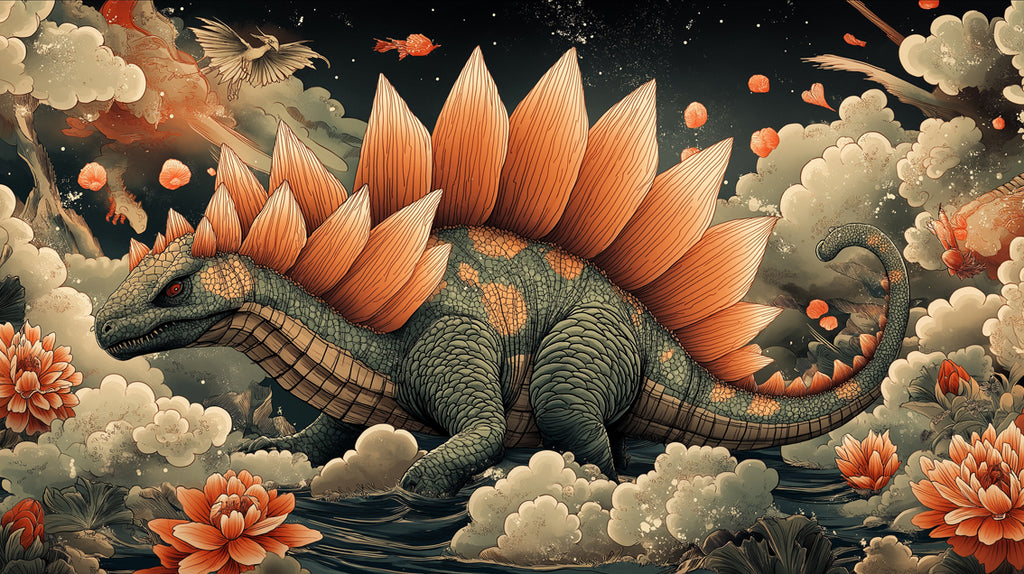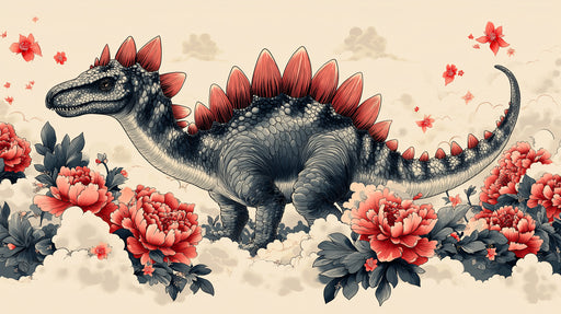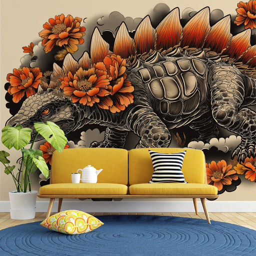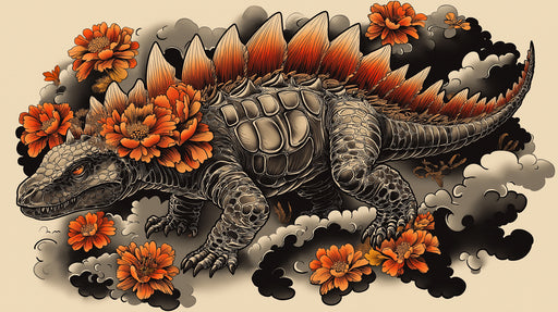 Révelez votre côté sauvage avec ce fond d'écran captivant, mettant en vedette un puissant stégosaure représenté dans un style artistique dramatique et inspiré des tatouages. Le dinosaure est illustré avec des écailles sombres et cuirassées ainsi que des plaques orange vif le long de son dos et de sa queue, s'élevant majestueusement à travers des nuages tourbillonnants et des fleurs orange vibrantes. Des oiseaux lointains et des formes de cœur subtiles ajoutent une touche fantaisiste au ciel, créant une présence imposante mais artistique, évoquant un sentiment de puissance, mystère ancien et expression artistique audacieuse. Cette illustration est parfaite pour créer une ambiance unique, audacieuse et artistique dans bureaux, salles de jeux, ou tout espace qui célèbre un design audacieux, des créatures anciennes et une touche d’art rebelle.