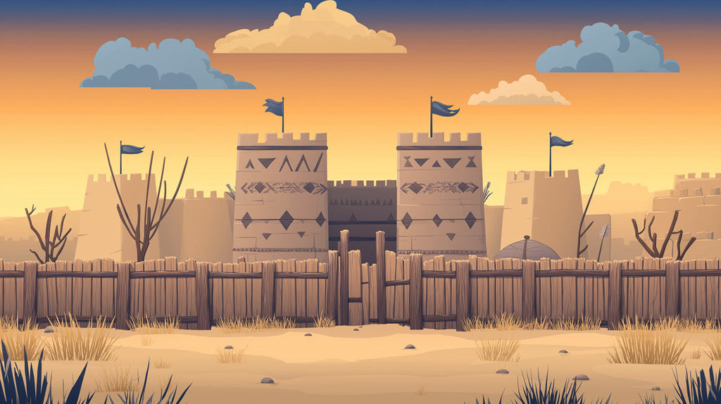 Les oranges et les jaunes chaleureux dans le ciel complètent les bruns terreux des forteresses, tandis que les drapeaux bleus offrent un contraste frappant. Les couleurs imitent un paysage de désert baigné de soleil, créant une harmonie visuelle.