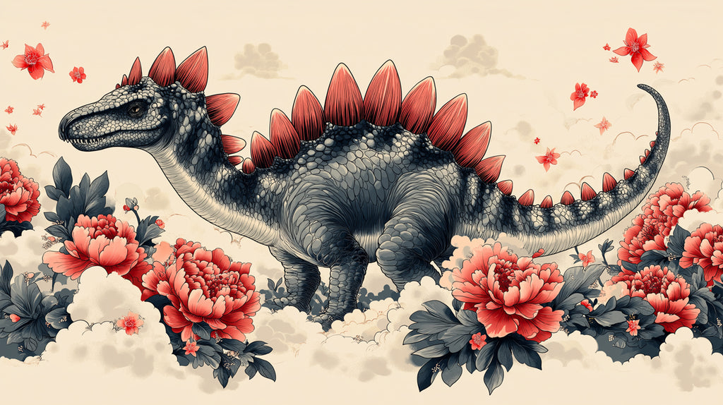 Plongez dans un jardin préhistorique de fantaisie avec ce papier peint enchanteur, mettant en scène un majestueux mais gracieux stégosaure orné d'épines rouge vif, élégamment dressé au milieu d'un paysage luxuriant de pivoines en fleurs et d'une végétation délicate. L'arrière-plan doux et texturé, parsemé de nuages, crée une ambiance rêveuse et sereine. L'expression douce du dinosaure et ses détails complexes s'harmonisent magnifiquement avec les éléments floraux fantastiques, évoquant un sentiment de merveille, tranquillité et beauté intemporelle. Cette illustration est parfaite pour créer une atmosphère calme, inspirante et unique dans les chambres d'enfants, nurseries, salles de jeux, ou tout autre espace qui célèbre la fantaisie, la nature et l'attrait des créatures anciennes réimaginées.