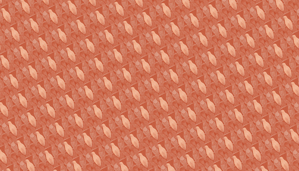 This charming monochromatic bird wallpaper offers a warm and sophisticated take on a classic botanical theme. The repeating pattern features small, stylized birds perched among broad tropical leaves, all in a beautiful palette of warm orange tones. The hand-drawn texture and subtle variations in color give the wallpaper a rustic, earthy feel. It's an excellent choice for a cozy reading nook, a warm dining room, or a stylish cafe that needs a touch of nature-inspired elegance.
