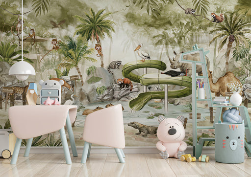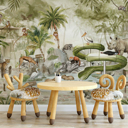 Vivawalls StoreThe Vintage Jungle Zoo Animals Mural Wallpaper depicts a lively zoo scene set in a lush jungle, rendered in a vintage, sepia-toned watercolor style...
