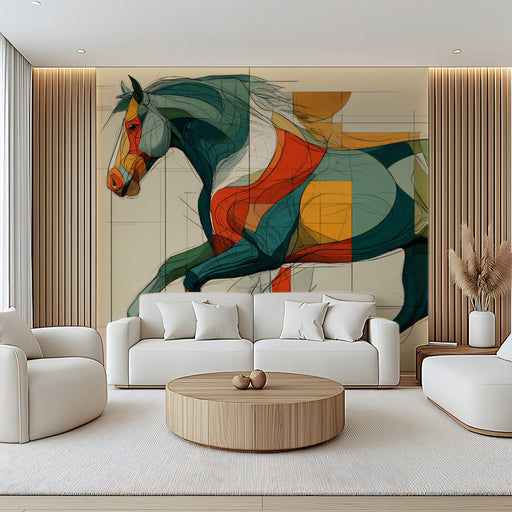Faites une déclaration artistique audacieuse avec ce papier peint captivant, mettant en vedette un portrait abstrait dynamique de la tête d'un cheval. Le cheval est représenté avec des formes géométriques fluides et des lignes qui se chevauchent dans une palette vibrante de vert profond, orange chaud et blanc éclatant, créant une sensation de mouvement élégant et d'élégance moderne. Des lignes de grille subtiles et des éléments circulaires en arrière-plan ajoutent à la conception complexe, soulignant sa profondeur artistique. Cette illustration est parfaite pour créer une ambiance énergique, artistique et contemporaine dans les salons, bureaux ou tout espace qui apprécie l'art moderne, les motifs animaliers et les formes géométriques audacieuses.