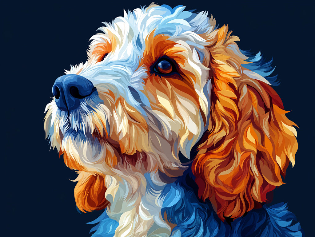 Le fond bleu foncé offre un contraste marqué avec les couleurs vibrantes du pelage du chien. Le bleu dans le pelage s'harmonise avec le fond, tandis que l'orange et le blanc ajoutent des reflets et créent une sensation de profondeur. La combinaison générale des couleurs est équilibrée, avec le fond sombre qui accentue la luminosité et la richesse des couleurs du pelage.