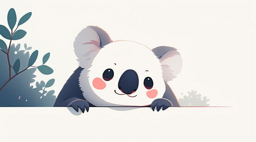 VivawallsCe papier peint représente un koala mignon et câlin avec de grands yeux et des oreilles orange, entouré de feuilles vertes et d'autres éléments na...