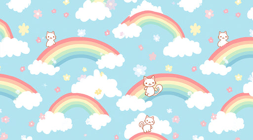 VIVAWALLSLe motif Kawaii Chatons Arc-en-ciel Nuageux est un dessin joyeux et répétitif. Il représente de multiples arcs-en-ciel colorés surplombant des nu...