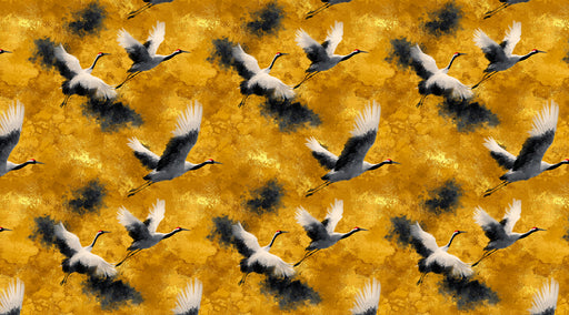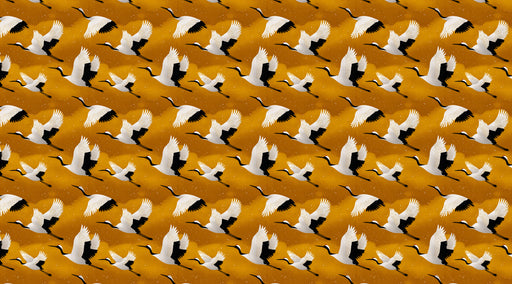 Afficher tous les détailsPapier peint mural à motif de grues dorées en vol | Motif répétitif, contraste élevé, style asiatique dynamique