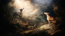 The Classical Greyhound Hunting Scene Mural Wallpaper is a dramatic and deeply atmospheric artwork reminiscent of the Baroque period. The scene features two majestic greyhounds and two rabbits in a darkly lit, rugged cave or grotto. A beam of dramatic, divine light pierces the stormy sky, highlighting the figures and giving the composition a high contrast and intense emotional depth. The rich, dark browns and ochres create a solemn, traditional, and powerful statement. This mural is ideal for a stately living room, a traditional study, or a sophisticated lounge with a commanding, old-world feel.
