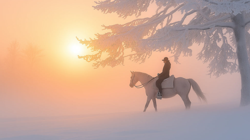 Affiche un cavalier à cheval sous un doux coucher de soleil, avec une branche d'arbre enneigée qui s'arque à travers la scène. Le mélange de tons chauds du coucher de soleil et de neige fraîche crée une ambiance sereine et élégante.