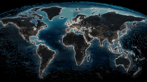 Le papier peint mural « Éclat global pointillé » présente une carte abstraite et saisissante . Les continents sont composés de formes blanches com...