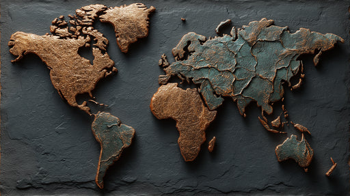 Carte en relief texturé. Les continents se distinguent par deux textures/couleurs contrastées : un cuivre/bronze chaud et rugueux (Amérique du Nor...