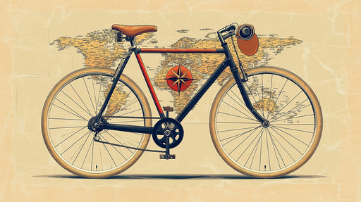 Papier peint mural représentant un vélo de randonnée marron sur une carte vintage | Thème cyclisme rétro, tons sépia, voyage autour du monde