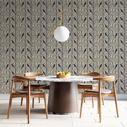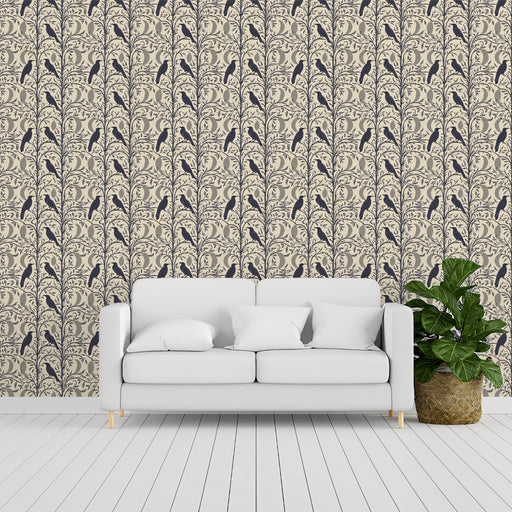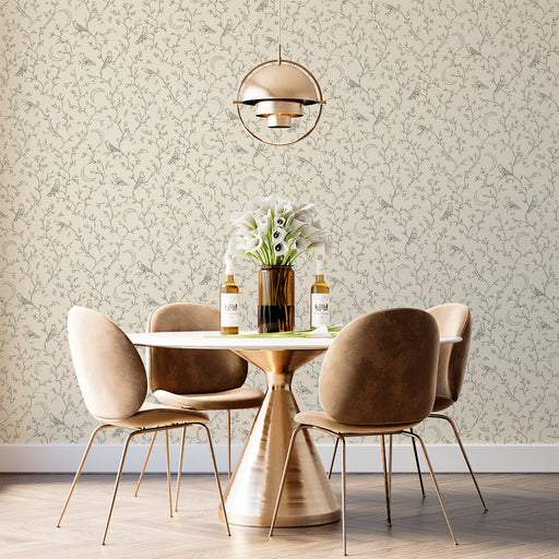 VIVAWALLSA highly detailed and ethereal wallpaper with a fine, intertwining pattern of branches and delicate songbirds. The design is in a soft, almost eth...