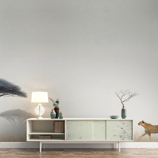 VIVAWALLSThe Misty Savanna Cheetah Mural Wallpaper is an atmospheric and tranquil scene. The design captures a vast African plain shrouded in a soft, cool f...