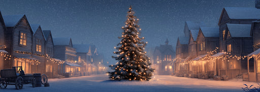 Afficher tous les détailsPapier peint mural de Noël représentant une ville de l'Ouest enneigée | Scène nocturne cinématographique, sapin illuminé, lumières de Noël rustiques