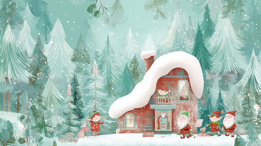 Afficher tous les détailsPapier peint mural hivernal féerique représentant une maison d'elfe | Contraste menthe et rouge, forêt de conte de fées, illustration douce
