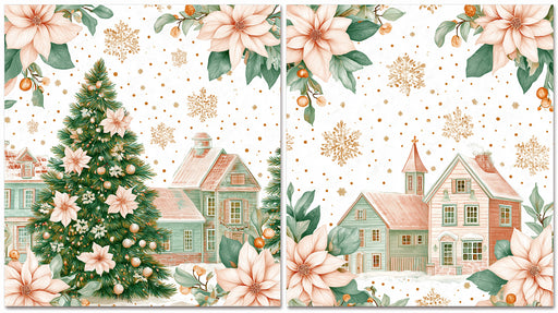 Afficher tous les détailsPapier peint mural double panneau motif village pastel | Poinsettias délicats, tons vert menthe et pêche, illustration élégante