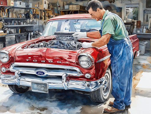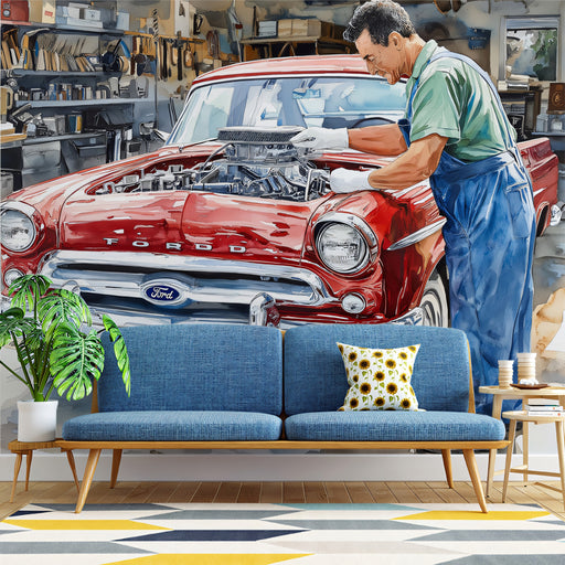 Réparation de moteur Ford classique dans un garage détaillé - Murale | Art automobile vintage