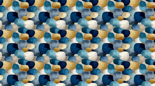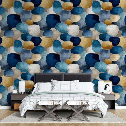 Papier peint mural contemporain en grappes de galets | Bleu marine, moutarde et pierre