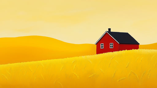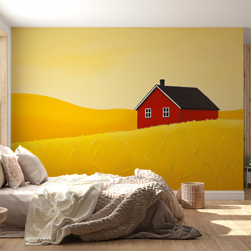 Mural Papier Peint Maison Rouge Stylisée dans un Champ Doré | Scène Rurale Minimaliste