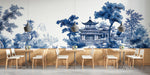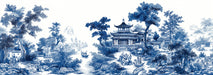 The Blue White Chinoiserie Landscape Mural Wallpaper is designed in the style of classic blue and white porcelain. It depicts a detailed Chinese landscape with ancient pavilions, twisting pine trees, mountains, rivers, and figures in traditional clothing. The crisp blue on white creates a fresh yet timelessly elegant look.
