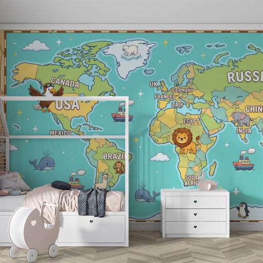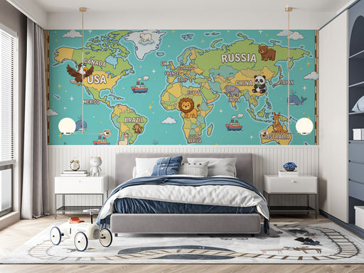 Colorful World Map Educational Mural Wallpaper | Modern Geographic Art