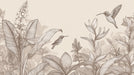 Create a wall of understated beauty with this refined wallpaper, featuring delicate line art of exotic plants and hummingbirds. The design uses intricate, thin lines to depict tall stalks of flowers and broad leaves, creating a sense of height and growth. The monochrome beige color scheme is soft and versatile, blending seamlessly with many interior styles. This illustration evokes a sense of grace, lightness, and natural harmony, perfect for bedrooms, bathrooms, or minimalist living areas.