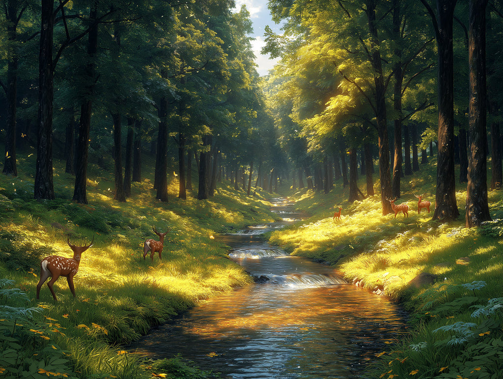 Ce papier peint représente une belle scène de forêt avec des cerfs dans une clairière ensoleillée. Les couleurs riches de la forêt, notamment diverses nuances de vert, de marron et de lumière dorée, créent une atmosphère chaleureuse et immersive. Il peut donner à la chambre à coucher l'impression d'être une retraite paisible dans la nature, favorisant la relaxation et un sentiment de calme.
