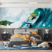 The Fox Surfer Cartoon Mural Wallpaper is a fun, whimsical illustration with a light-hearted mood. An anthropomorphic fox character in a yellow top is captured riding a massive, curling wave rendered in bright teal and blue. The background is a soft, simple wash of pale blue and white, with a subtle tropical beach in the distance. The clean, cartoon style and bright color palette create a cheerful, playful, and energetic scene. This mural is ideal for a child's bedroom, a lively playroom, or a casual, beach-themed space.