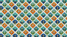 The Geometric Floral Tile Pattern Mural Wallpaper features a repeating geometric pattern of stylized flowers in blue, green, and orange tones. The design mimics traditional ceramic tiles, creating a retro and sophisticated look. This mural is perfect for a kitchen backsplash, a bathroom, or a hallway.