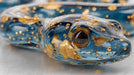 This striking close-up digital painting features the head of a stylized snake, rendered in a glossy, dark blue glass or liquid material. The snake is richly detailed with accents of shimmering gold leaf and golden droplets that appear to be floating on its surface. The artwork uses extreme texture and highly reflective surfaces to create a sense of luxurious, surreal artistry and is focused entirely on the captivating detail of the creature's eye and head.