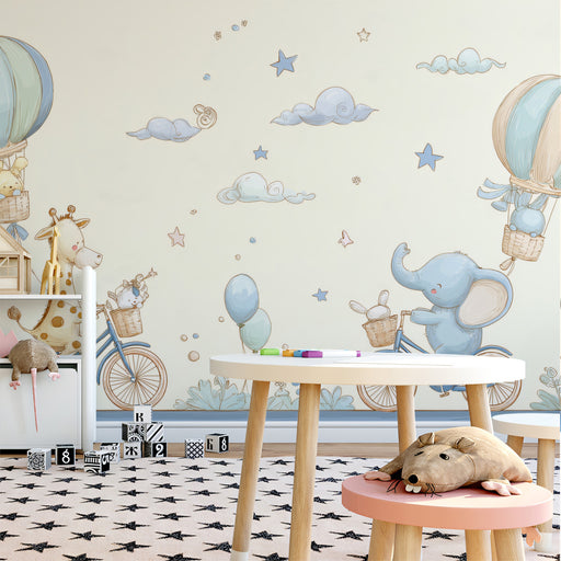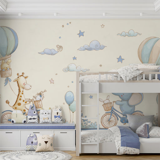 Create a world of smiles for your little ones. This charming, soft-toned mural features friendly forest animals—including a koala, red panda, and squirrels—around a smiling tree. With its gentle blue-green palette and adorable characters, it’s the perfect backdrop for a nursery or playroom, designed to inspire happiness and gentle exploration.