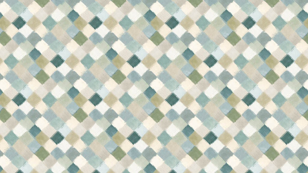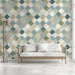 The Modern Diamond Mural Wallpaper is a dynamic and artistic take on a classic geometric pattern. Its design features a repeating harlequin (diamond) pattern composed of hand-painted squares in a soft, muted palette of dusty blues, sage greens, and warm beiges. The visible brushstrokes give the mural a unique, handcrafted charm, while the diamond pattern adds a sense of playful movement. It is an ideal choice for a lively living room, a modern dining area, or a creative bathroom that seeks a bold, artistic focal point.